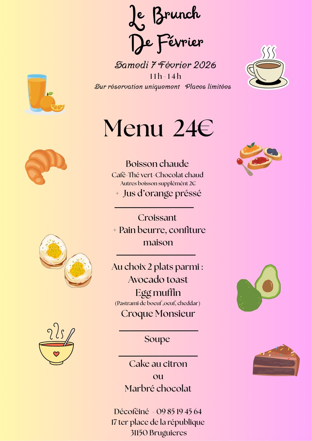 Le restaurant Décoféiné à bruguieres organise un samedi par mois un brunch . Celui du mois de février aura lieu le samedi 6 février de 11h à 14h