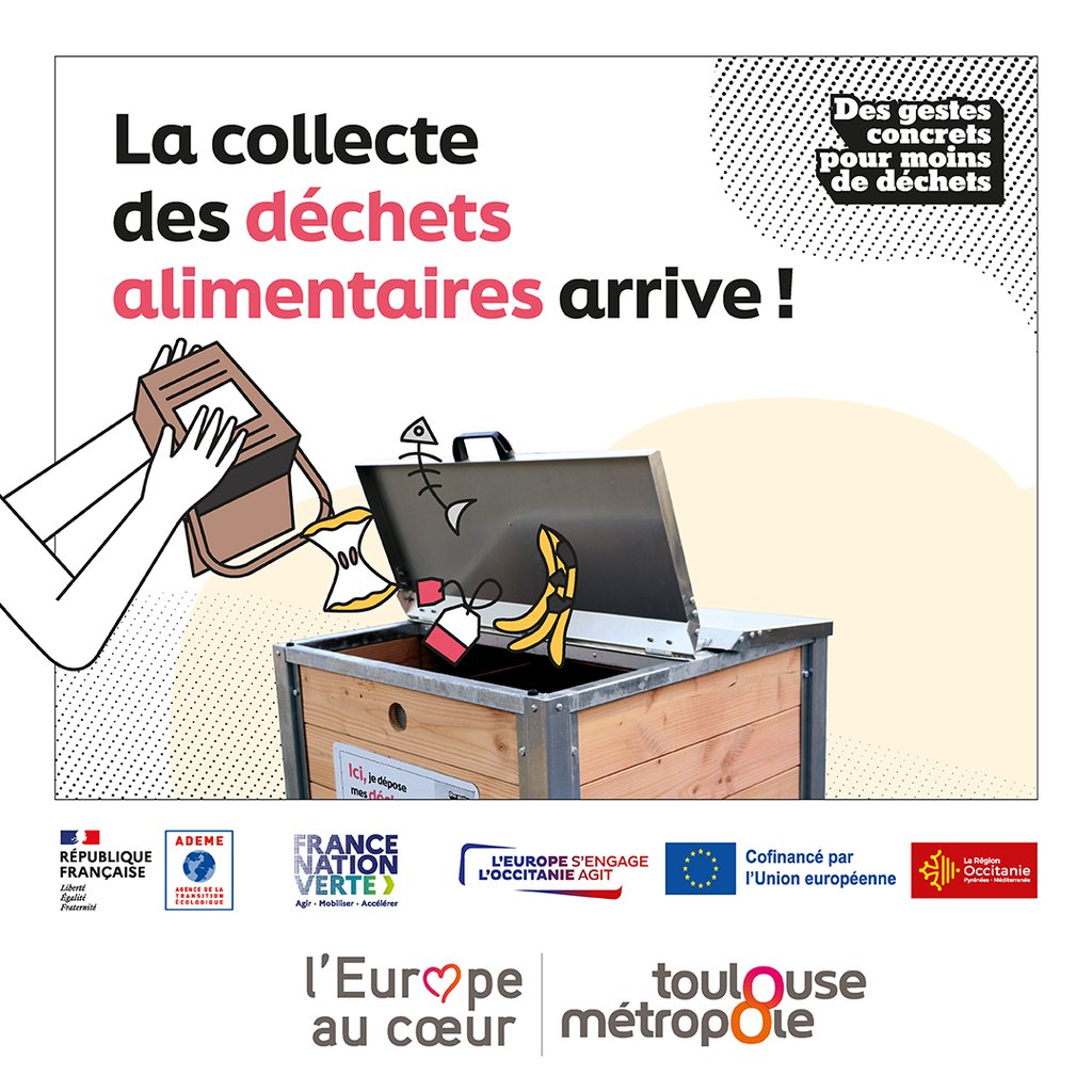 TOULOUSE MÉTROPOLE VOUS INFORME : À partir du 30 janvier 2026, Toulouse Métropole installera progressivement des bornes de collecte des déchets alimentaires dans la commune.