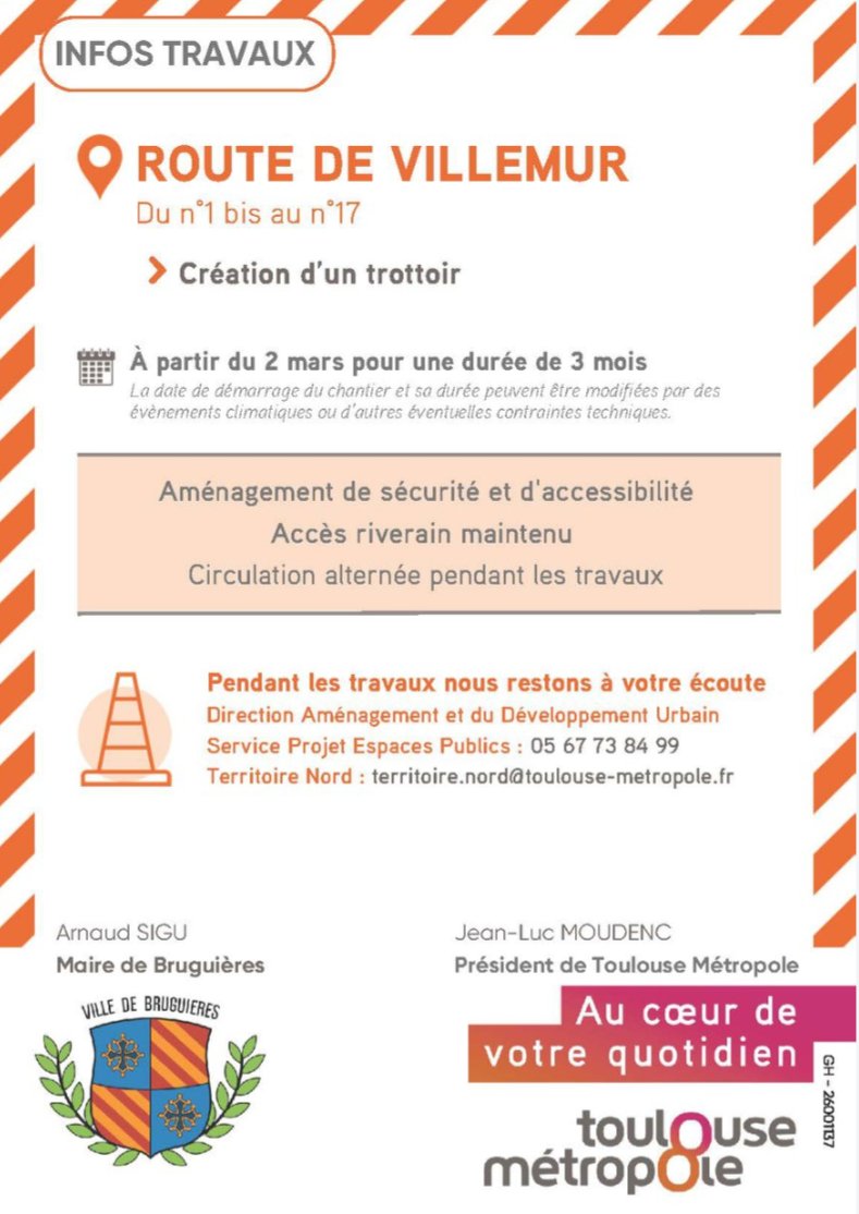 TOULOUSE MÉTROPOLE VOUS INFORME 🚧 - TRAVAUX📍 ROUTE DE VILLEMUR (DU N°1 BIS AU N°17)