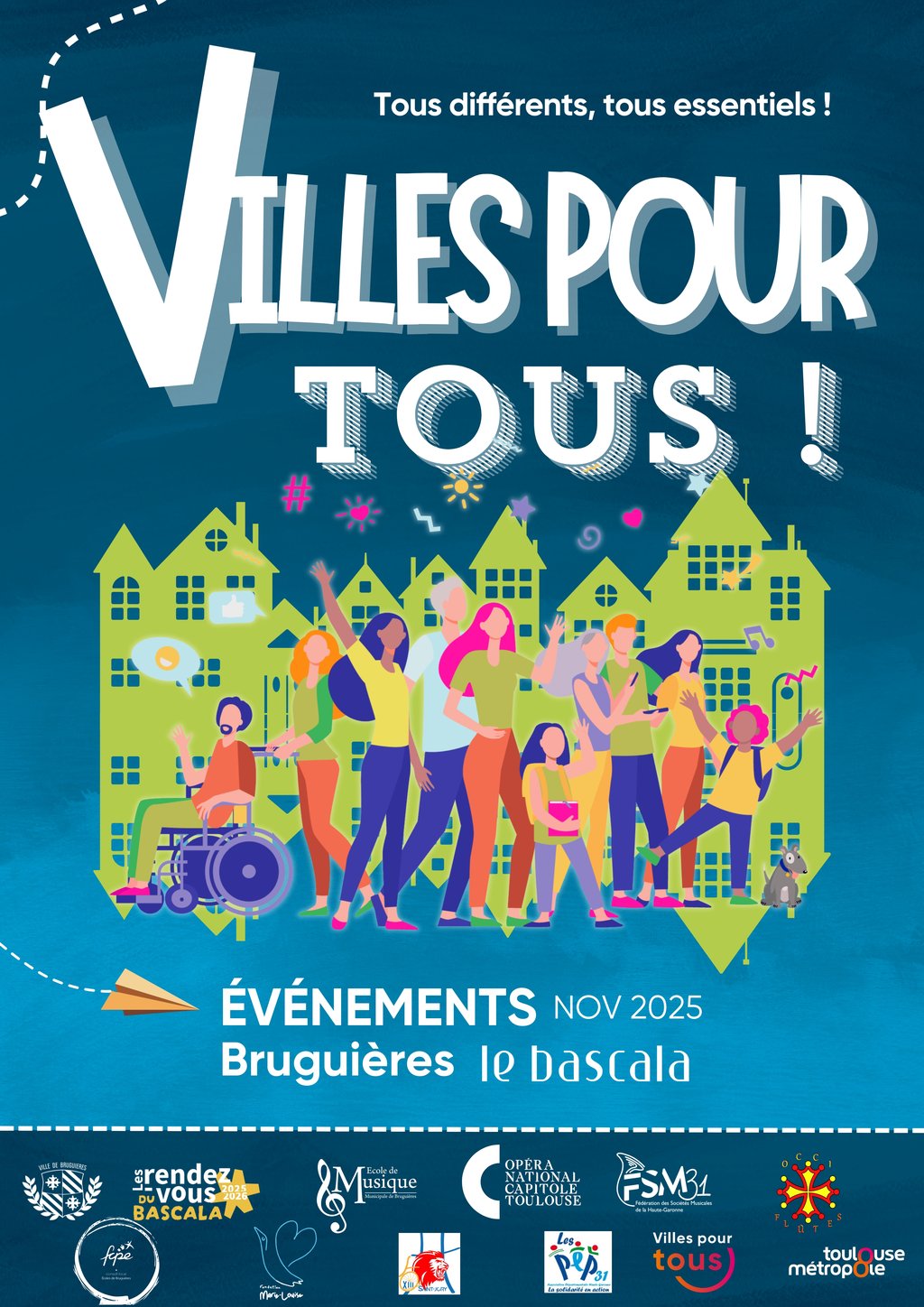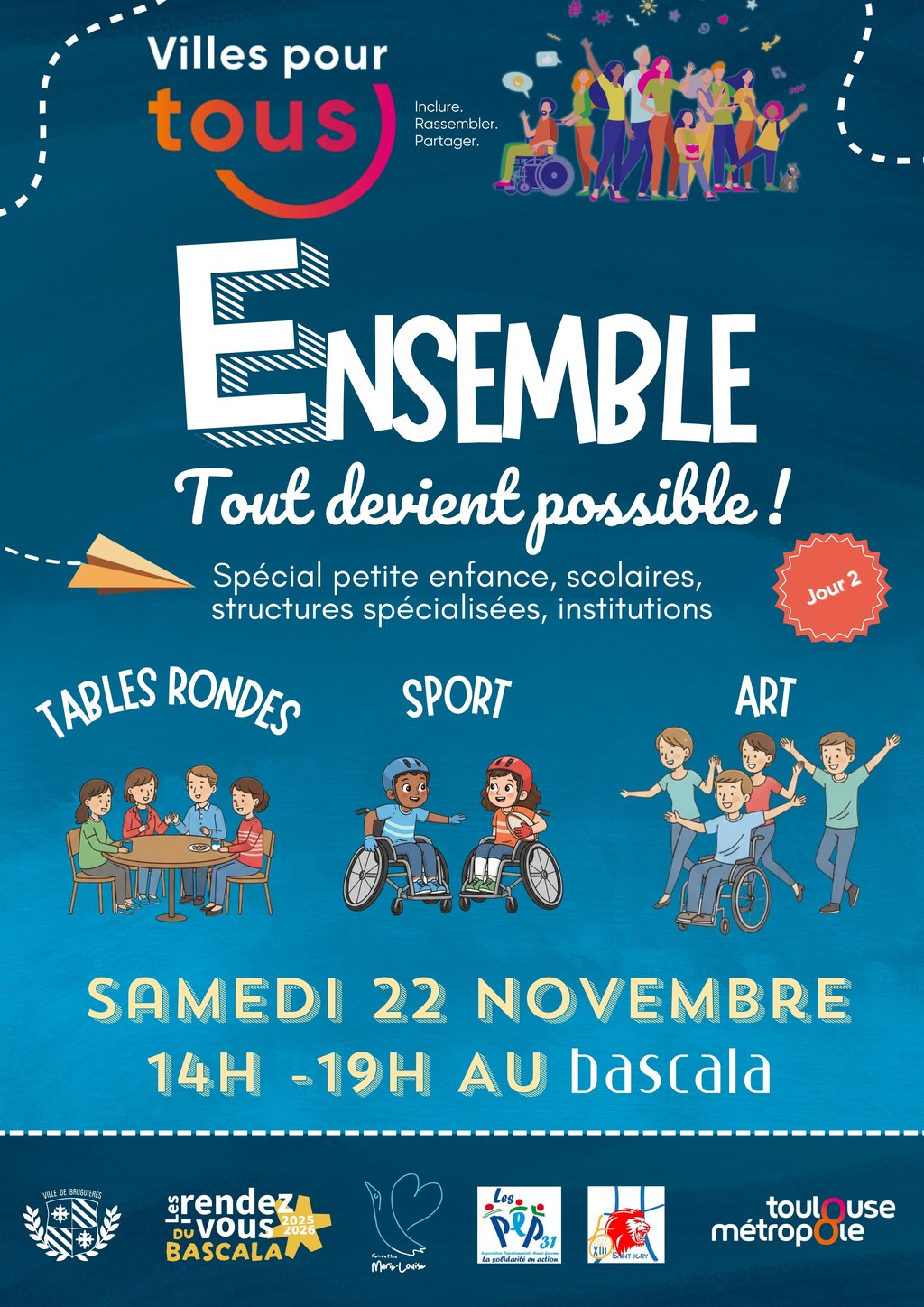 Les services de la Ville, en partenariat avec @Villes pour tous, @Toulouse Métropole, la Fondation Marie-Louise, l’École de Musique Municipale, le Bascala, la FCPE de Bruguières, le club de rugby fauteuil de Saint-Jory, Cécile Robert (APF), le SESSAD, Graines de jeux, l’Établissement public du Capitole, le PRH31et l’Orchestre Départemental Junior de Haute-Garonne ouvrent les portes du Bascala pour un week-end d’inclusion, de partage et de découvertes !
