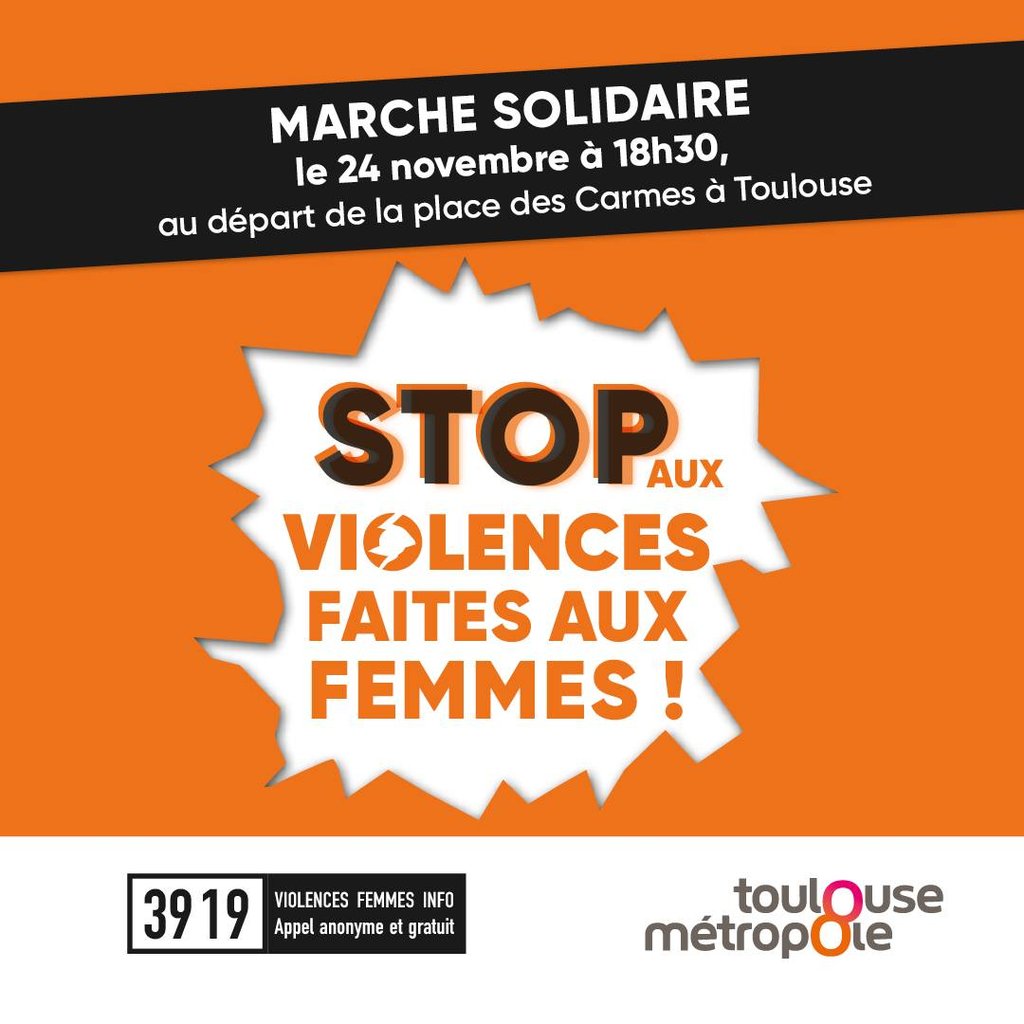 TOULOUSE METROPOLE VOUS INFORME🚶🧡 - Le lundi 24 novembre à 18h30 au départ de la place des Carmes à Toulouse : UNE MARCHE SOLIDAIRE CONTRE LES VIOLENCES FAITES AUX FEMMES