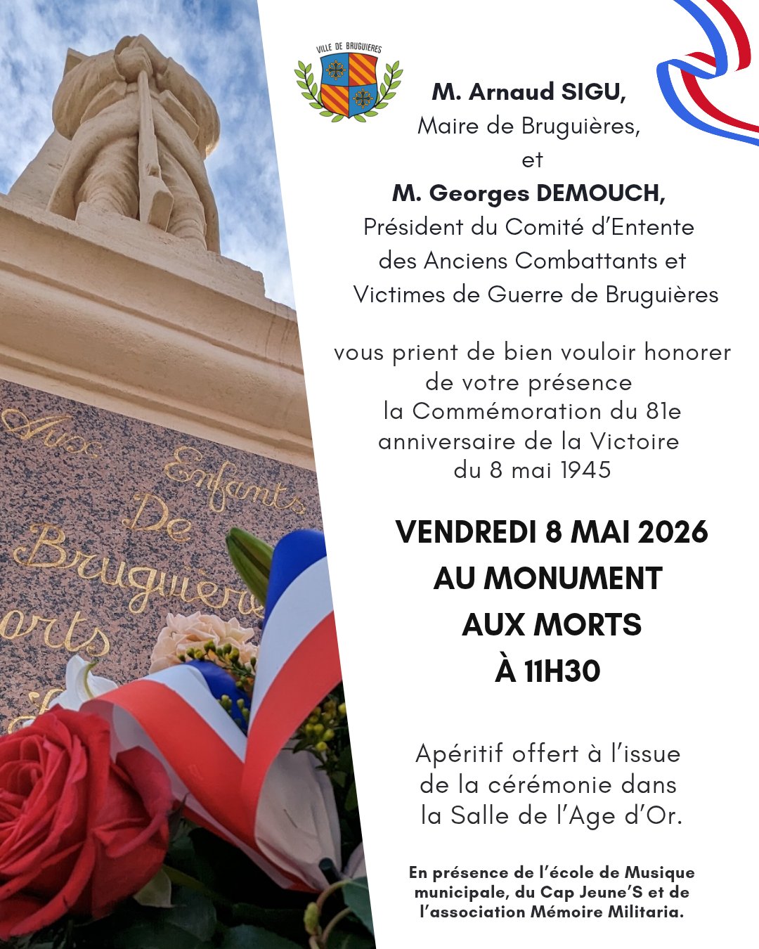 M. Arnaud SIGU, Maire de Bruguières, et M. Georges DEMOUCH, Président du Comité d’Entente des Anciens Combattants et Victimes de Guerre de Bruguières vous prient de bien vouloir honorer de votre présence la Commémoration du 81e anniversaire de la Victoire du 8 mai 1945