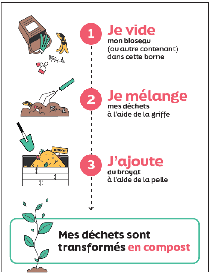 Les bornes sont accessibles 7j/7 et 24h/24. Vous pouvez y déposer en vrac l'ensemble des déchets alimentaires produits à la maison. À chaque apport, vous êtes invité à déposer vos déchets alimentaires. Pour les composter, vous devez ensuite les mélanger avec l’aide de la griffe puis ajouter du broyat (outils et broyat mis à disposition dans le bac de broyat à côté de la borne).